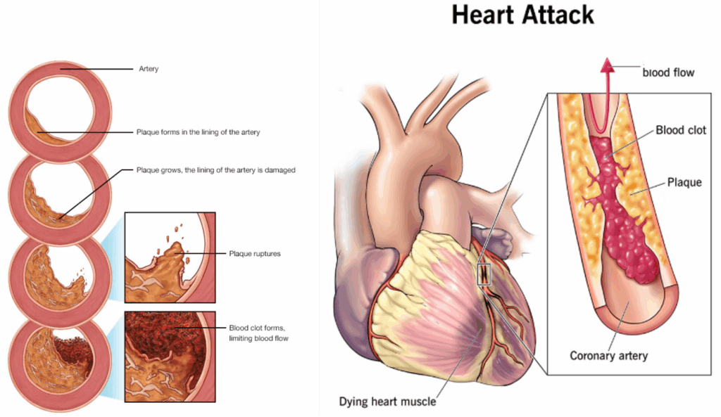 මෙම ක්රියාවලිය ආරම්භ වන්නේ හෘත් පේශිවලට රුධිරය සපයන ධමනි (කිරීටක ධමනි) වල බිත්තිවල ලිපිඩ බහුල මේද තට්ටු සෑදෙන නිදන්ගත ප්රදාහක තත්වයක් වන ධමනි සිහින් වීමෙනි. හෘද කුටි සෑම විටම රුධිරයෙන් පිරී තිබුණද, හදවතේ අභ්යන්තරම පටලය දැඩි බැවින් හදවතට ඒ කිසිවක් භාවිතා කළ නොහැක. වෙනත් ඕනෑම ඉන්ද්රියයක් මෙන්, හෘද මාංශ පේශීන් ද ඔක්සිජන් සහ පෝෂ්ය පදාර්ථ රුධිර නාල හරහා ලබා ගත යුතුය. ඒවා කිරීටක ධමනි ලෙස හැඳින්වේ. රුධිර සැපයුම නොමැතිව හදවතට මිනිත්තු 30 කට වඩා ජීවත් විය නොහැක.